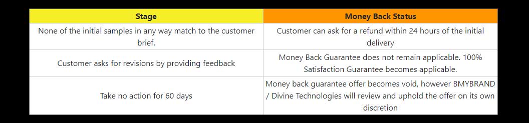 We provide a money-back guarantee in the event that we are unable to meet your expectations since we are so confident in our abilities and design quality. We offer the money-back guarantee in good faith, and we anticipate that our customers will do the same. To obtain the designs they like, customers are typically very honest, cooperative, and provide insightful comments. A minority does, however, attempt to unfairly exploit this freedom. They will simultaneously make orders with numerous suppliers, obtain design proposals from each, and then request a refund. This practice abuses human skills and is unfair and unethical. We apologise, but we would prefer not to do business with you if you are one of those people.